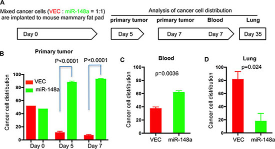 Figure 3: Overexpression of miR-148a alters 4T1 cancer cell propagation in vivo. (A) Illustration of the procedure for tracking cancer cell propagation in vivo. 4T1 control cells with expression of iRFP (VEC, red) and 4T1cells with expression of miR-148a and GFP (miR-148a, green) were mixed and implanted into the mammary fat pad of Balb/c mice. Mice were sacrificed and tissues were harvested at the indicated times. Tissues were digested followed by analysis using flow cytometry. Cancer cells with expression of iRFP or GFP were quantified as the percentage of the total number of cancer cells in each sample. (B) Distribution of cancer cells in primary tumors at day 5 and day 7. Quantification of cancer cells at day 0 is from mixed cells prior to implantation. (C) Distribution of cancer cells in blood at day 7. (D) Distribution of cancer cells in lungs at day 35. Error bars are Standard Errors (n = 5). P values were calculated with paired, two-tailed t test.