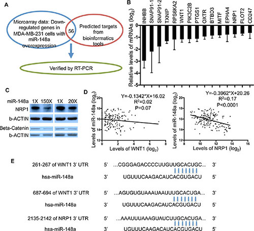 Figure 5: Identification of WNT1 and NRP1 as target genes of miR-148a in MDA-MB-231 cells. (A) Illustration of strategy used to identify target genes of miR-148a. (B) qRT-PCR analysis was performed to validate mRNA levels altered by overexpression of miR-148a. (C) Protein abundance of WNT1 and NRP1 altered by miR-148a were determined by Western Blot. Two levels of miR-148a overexpression (150× and 20×) were achieved in MDA-MB-231 cells. (D) Correlation analysis with linear regression between levels of miR-148a and its target genes was done with GraphPad Prism. The expression levels were extracted from the TCGA database. (E) The 3′-UTR of the WNT1 and NRP1 genes contain binding sites for miR-148a seed region according to the TargetScan prediction program.