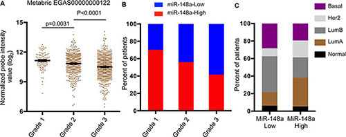 Figure 6: Low expression of miR-148a is associated with worse diagnosis of breast cancer patients. Data was extracted from METABRIC data [55] (A) miR-148a expression was analyzed in patients stratified by tumor grade. Error bars are standard errors (grade 1, n = 104; grade 2, n = 496; grade 3, n = 623). P values were calculated with unpaired, two-tailed t test. (B) Patients were categorized as high or low expression of miR-148a and percentage of patients with high or low expression of miR-148a was calculated in patients stratified by tumor grade. (C) Percentage of patients within each breast cancer subtype was calculated in patients categorized by high or low expression of miR-148a in primary tumors.
