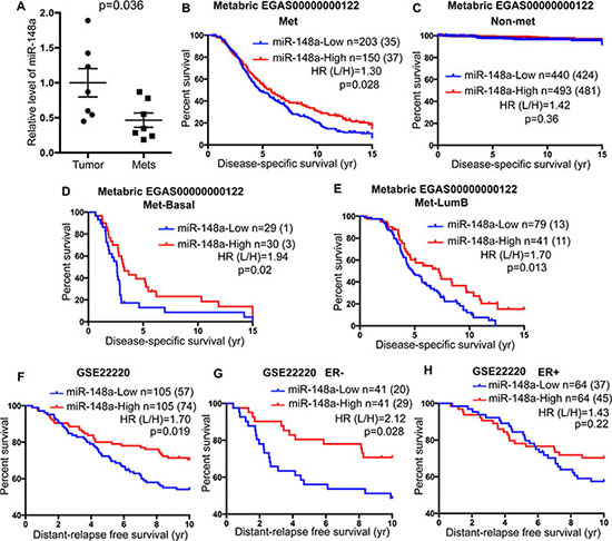 Figure 7: Low expression of miR-148a is associated with poor prognosis of breast cancer patients. (A) Levels of miR-148a expression were determined in primary (Tumor) and metastatic (Mets) tumor samples from breast cancer patients [19] and normalized to the levels of miR-148a in primary tumors. Error bars are standard errors (n = 7). P value was calculated with unpaired, two-tailed t test. (B–E) Kaplan-Meier curves for disease-specific survival for high and low expression of miR-148a in breast cancer patients with metastasis (B) or without detectable metastasis (C). Basal subtype (D) and LumB subtype (E) of patients with metastasis were further analyzed using Kaplan-Meier curves for high and low expression of miR-148a. Data was extracted from METABRIC data [55]. Survival time was cropped at 15 years. (F–H) Kaplan-Meier curves for distant-relapse free survival for high and low expression of miR-148a in total breast cancer patients (F), ER-negative patients (G), and ER-positive patients (H). Data was extracted from GSE22220. B-H, P values were calculated with Log-rank (Mantel-Cox) test. Hazard ratios were calculated with the method of Mantel-Haenszel).