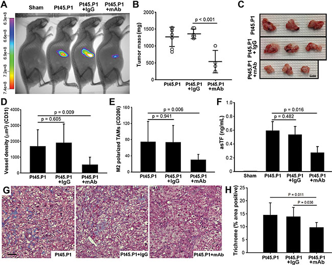 Figure 3: Effects of RabMab1 on the growth of orthotopically implanted Pt45.P1 cells in nude mice. (A) Tumor progression was monitored in vivo via CVM-SapC-DOPS imaging over 7 weeks (n ≥ 3). (B) Quantification of primary tumor mass (n ≥ 3). (C) Representative specimens, resected tumors. (D) Eight view fields per specimen (n = 3 per specimen type) were assessed for vessel density, and (E) for M2 polarized TAMs. (F) Plasma samples from each cohort bearing Pt45.P1 tumors were assayed for asTF using ELISA (n = 3). (G) Representative images, Masson’s Trichrome stain (scale bar = 50 μm). (H) Quantification of percent area positive for Masson’s Trichrome stain. (RabMab1 = mAb).