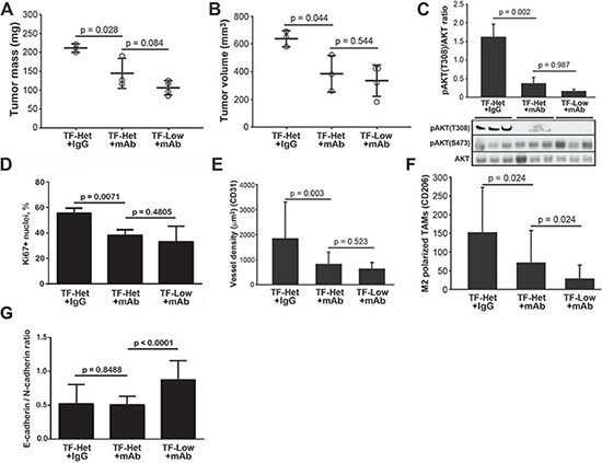 Figure 5: RabMab1 suppresses orthotopic growth of Pt45.P1 cells with equal efficacy, yet differentially affects the levels of tumor associated M2 polarized TAMs in TF-Het and TF-Low mice. (A) Average primary tumor mass, TF-Low and TF-Het SCID mice bearing orthotopic Pt45.P1 tumors (n ≥ 3). (B) Average primary tumor volume (n ≥ 3). (C)Western blot, phosphorylation of AKT (T308 & S473) in the three cohorts; each lane is a sample of an individual tumor. (D) Quantification of percent of Ki67+ nuclei, (E) vessel density, (F) levels of M2 polarized TAMs, and (G) E-cadherin/N-cadherin ratio in the tumors grown in the three cohorts; a minimum of eight view fields per each tumor (n ≥ 3 per specimen type) were counted and averaged. (RabMab1 = mAb).