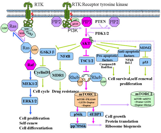 Members of the PI3K family are lipid kinases involved in multiple cellular process, including proliferation, differentiation, migration, metabolism and survival [24]. PI3K is generally classified into three classes according to their substrate specificity and subsequence homology, among which, the class I is most vital to the tumorigenesis. Class I consisted of a catalytic subunit p110 (α, β, γ) and a regulator subunit p85. A fourth p110 isoform (p110δ) is paired with the p101 regulatory subunit in class IB PI3Ks. Upon ligand binding, phosphorylated tyrosine residing in activated RTKs will bind to p85. The subsequent conformation change will release the catalytic subunit p110 [25], where activated p110 phosphorylated the phosphatidy-linositol-3, 4-bisphosphate (PIP2) into the second messenger phosphatidylinositol-3, 4, 5-bisphosphate (PIP3). This reaction can be reversed by the PI3K antagonist PTEN (phosphatase and tensin homolog deleted on chromosome ten) [26]. Subsequently, PIP3 will recruit the downstream Akt to inner membranes and phosphorylates Akt on its serine/threonine kinasesites (Thr308 and Ser473) [27, 28]. Activated Akt is involved in the downstream mTORC1 mediated response to biogenesis of protein and ribosome.