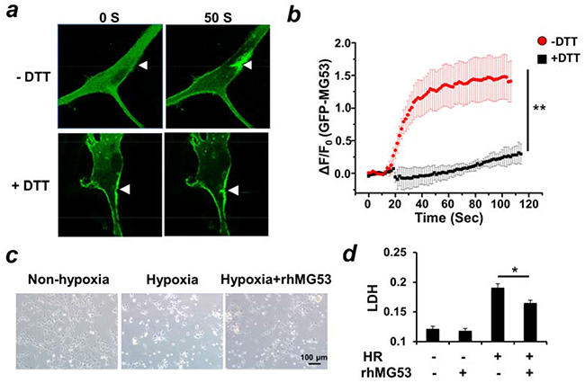 Figure 2: MG53 protects against injuries to neuron cells. a. Microelectrode penetration of rat neuronal stem cells overexpressing GFP-MG53 led to nucleation of GFP-MG53 to injury site. The translocation of GFP-MG53 upon mechanical injury was inhibited by treatment of DTT (10 μM). b. Summary data for time-dependent accumulation of GFP-MG53 at the injury sites were plotted. Data are mean ± S.E. for n=8 cells from each group derived from 3 independent experiments. **P<0.01 +DTT vs. -DTT c. HT22 cells were treated with hypoxia for 18 hours and re-oxygenation for 6 hours. Treatment of rhMG53 preserved cell viability (c) and prevented LDH release as an indicator for plasma membrane injury d, *P<0.05 HR vs. HR+rhMG53, n=??