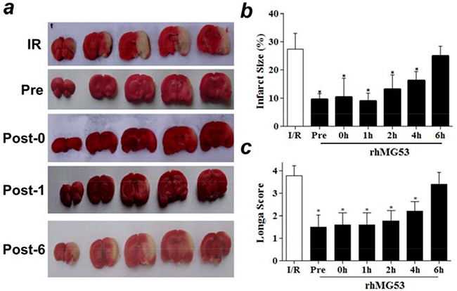 Figure 3: rhMG53 protects against I/R injury to rat brains. a. Representative images of TTC staining of rat brain slides showed intravenous delivery of rhMG53 reduced infarct area as compared to saline treatment as controls. IR - rats receiving no treatment of rhMG53; Pre - rhMG53 administered prior to ischemia; Post-0, rhMG53 administered immediately after ischemia; Post-1, rhG53 administered 1 hour post reperfusion; and Post-6, rhMG53 administered 6 hours post reperfusion. b. Infarct sizes of different groups were quantified and summarized. rhMG53 treatment significantly reduced infarct area at different time points of administrations (pre, 0, 1h, 2h and 4h post reperfusion). The beneficial effect of rhMG53 was diminished when the animals were treated by rhMG53 6 h post reperfusion. *P<0.05 vs. I/R (n=7). c. Treatment of rhMG53 also led to significant improvement of behavior of the rats as demonstrated by Zea-Longa score. *P <0.05 vs. I/R (n=7 per group).