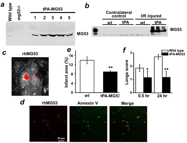 Figure 5: MG53 can cross the blood-brain-barrier to target to injured brain tissue. a. Serum samples from wt, mg53-/- and tPA-MG53 mice were subjected to immunoblotting against MG53. The results showed tPA-MG53 expressed high level of MG53 in blood circulation. Western blotting b. showed that circulating MG53 targets to injury side of brain upon ischemic surgery. c. IVIS spectrum in vivo imaging showed rhodamine-labelled rhMG53 can target to the injured brain area, which was further confirmed by co-staining of rhodamine-labelled rhMG53 (red) and Annexin V-FITC (green) in brain slices d. When tPA-MG53 mice were subjected to I/R injury to the brains, they displayed resistance to I/R injury as compared to wt control, as evidenced by reduced infarct area e. and decreased Longa score f.