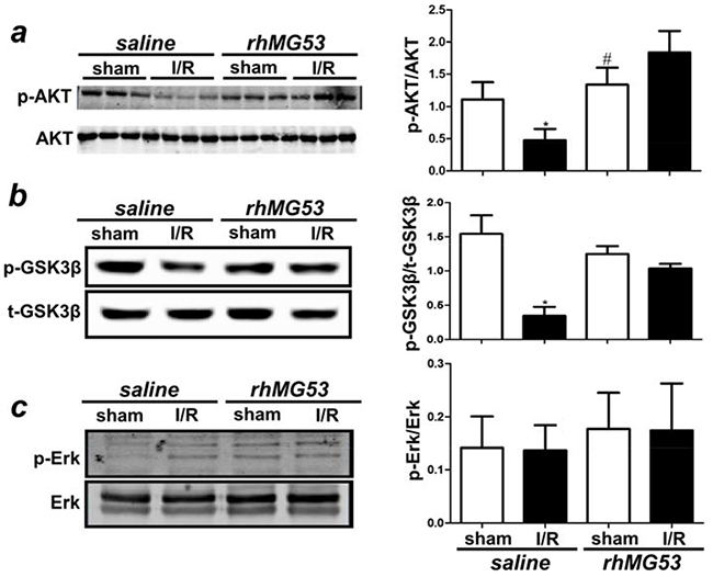 Figure 6: rhMG53 promotes pro-survival RISK pathway in response to I/R injury. a. Western blotting of rat brain lysates showed that while I/R injury reduced phosphorylation of Akt (p-Akt) level, treatment of rhMG53 significantly promoted p-Akt in injured brains. b. Immunoblotting analysis also showed that treatment of rhMG53 significantly rescued decrease of phosphorylation of GSK3β (p-GSK3β) associated with I/R injury; whereas Erk pathway remained unchanged c. *P<0.05 vs. sham (-rhMG53); #P<0.05 vs. I/R alone, n=6.