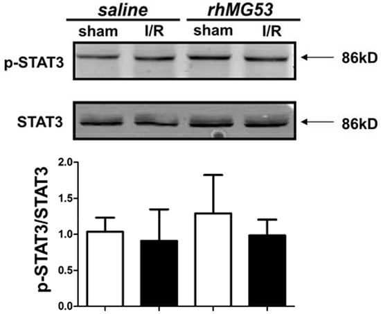 Figure 7: MG53 does not affect SAFE survival pathway. I/R injury with or without MG53 treatment had no effect on phosphorylation of STAT3 in brain (P=NS, n=6).