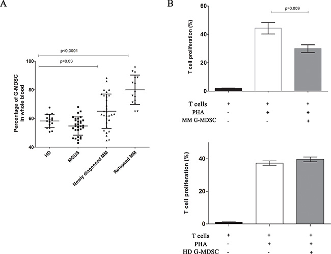 Figure 1: Increased frequency of G-MDSC in MM patients. The percentage of circulating G-MDSC was quantified in the peripheral blood of healthy donors, MGUS and newly diagnosed or relapsed MM patients by flow cytometry (panel A). MM G-MDSC-mediated T-cells suppression was assessed in autologous co-cultures. Mean frequency of CD3+ CFSE dim cells ± SD from four independent experiments in duplicate is shown (panel B).