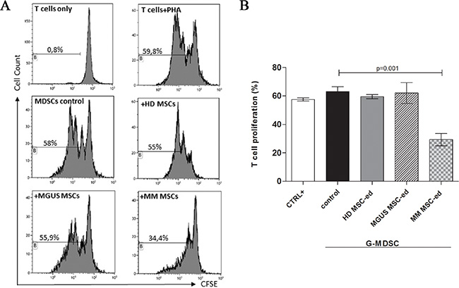 Therefore, even if HD-, MGUS- and MM-MSC are able to generate similar amount of G-MDSC cells, only MM-MSCed-G-MDCS exhibited suppressive effect on T cell proliferation.