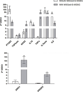 Figure 4: Expression of immune-modulatory and pro-angiogenic factors by MSCed-G-MDSC. The graphs report fold change values in gene expression of indicated genes (normalized to HD MSCed-G-MDSC) in MM- and MGUS-MSCed-G-MDSC. Only MM-MSCed-G-MDSC significantly upregulated TNFα, ARG1 and PROK2. Calculated value of 2^-ΔΔCt in HD MSCed-G-MDSC was 1.