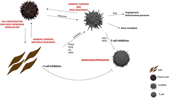 Figure 6: MM BM microenvironment. MM-MSC, both directly and through G-MDSC activation, support MM growth, survival and drug-resistance within an immunosuppressive BM microenvironment.