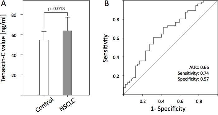 Figure 1: Serum concentration of Tenascin-C in healthy controls and non-small-cell bronchogenic carcinoma (NSCSC) patients. A. Bars represent the mean of n= 76 healthy controls and n = 116 NSCLC patients as determined by ELISA (p<0.013). B. Receiver operating characteristic (ROC) curves of Tenascin-C for the diagnosis of NSCLC patients versus healthy control samples.