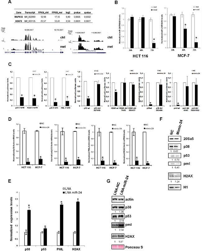Figure 1: miR-24 targets the melatonin-p53 pathway. (A) Graphs show the sequence coverage, as well as the signal intensity, of H2AFX (H2AX) and MAPK12 (p38-γ) in both vehicle and melatonin treated HCT 116 cell line. (B) HCT 116 and MCF-7 cells have been treated with melatonin for 24, 48 and 72 hours. The ratio between miR-24 and RNU49 levels, normalized to their respective untreated controls, are indicated in the graphs. (C) HCT 116 cells have been transfected with either negative control (NC) or miR-24 mimic and the indicated Dual Luciferase reporters. Values for NC are set to 1. *p < 0,01. (D, E) HCT 116 and MCF7 cells have been transfected with the indicated mimic (D) or LNA (E) and subjected to quantitative Real-Time PCR. Values have been normalized to NC or LNA. (F, G) Cells have been transfected with the indicated mimic (F) or LNA (G) and cell extracts have been subjected to immunoblot with the indicated antibodies. Numbers indicate signal quantification normalized to NC or LNA-NC.