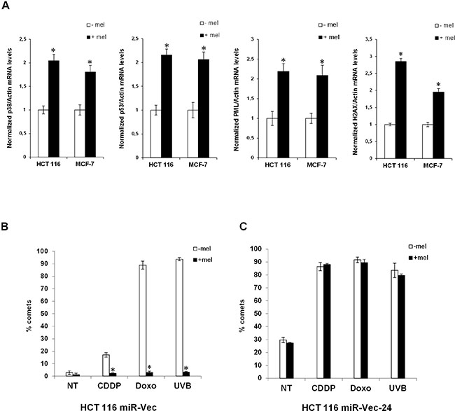 We have previously shown that melatonin activates the p53 pathway with a fast kinetics through stimulation of its membrane receptors, MT1 and MT2 [10, 11]. However, it remained unclear how melatonin could sustain the p53 pathway activation on the long term, which would eventually lead to inhibition of cell proliferation and protection from DNA damage accumulation. To clarify this, we performed a search in silico to identify miRNAs predicted to regulate the four components of the melatonin pathway: p53, p38, PML and H2AX. We used the microRNA.org database and identified 60 miRNAs putatively targeting all four genes simultaneously. Among those, only five had validated targets in Tarbase: miR-24, miR-217, miR-296–5p, miR-324–3p and miR-876–3p (Table 1). miR-24 (alias miR-24–3p) raised our interest as it showed the highest number of validated targets, it had been previously reported to target H2AX and inhibit DNA repair [45]. It is also upregulated in a variety of cancers as compared to non-tumoral tissues (Supplementary Figure S1). We also interrogated the expression of predicted miR-24 putative target genes in a RNA-Seq experiment previously performed in our laboratory in vehicle and melatonin treated cells for 48 hours, to look at global changes in mRNA expression following melatonin treatment. We identified 14 upregulated genes following melatonin treatment which were also miR-24–3p putative targets (Table 2). Among the 14 genes we identified H2AX and p38-γ (Figure 1A). To assess whether miR-24 could be regulated by melatonin, we measured its expression levels after treatment with melatonin of both HCT 116 and MCF-7 cells. We found that miR-24 levels were strongly reduced following 72 hours of melatonin treatment in both cell lines and this appear already evident at 48 hours in MCF-7 cells (Figure 1B). This prompted us to validate our four genes of interest as targets of miR-24. We analyzed their expression upon miR-24 transfection by Dual Luciferase assays, Real-Time qPCR and Western Blot. Dual Luciferase assays confirmed that all four genes were direct targets of miR-24 (Figure 1C) and deletion of the seed sequence of miR-24 abolished their regulation by miR-24 (Figure 1C). Both Real-Time qPCR and Western Blot analyses showed that p53, p38 and PML expression was decreased upon transfection of miR-24 (Figure 1D, 1F). H2AX was downregulated by miR-24 at the mRNA but not protein level, probably due to the targeting of a specific 3′UTR variant of H2AX by miR-24. Conversely, inhibition of miR-24 expression by LNA transfection induced the expression of p38, p53, PML and H2AX both at the mRNA (Figure 1E) and the protein (Figure 1G) levels. miR-24 overexpressed and downregulated levels are monitored by qPCR (Supplementary Figure S2A–S2B). Strikingly, p38, p53, PML and H2AX transcripts are up-regulated in response to melatonin thus it is opposite to that of miR-24 upon the identical experimental conditions in both HCT 116 and MCF-7 cell lines (Figure 2A).