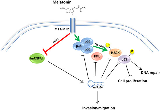 In the present manuscript, we show that melatonin downregulated miR-24, which targets four components of the melatonin activated pathway: p38, p53, PML and H2AX. By targeting these genes, miR-24 enhance cell proliferation and induce migration of cancer cells, while melatonin can revert these phenotypes in the presence of physiological levels of miR-24 but not when miR-24 is overexpressed by mimic transfection. We also show that miR-24 downregulation occur through intact MT1/MT2 receptor signalling, as it is abolished in the presence of the melatonin antagonist Luzindole. In addition, we propose the involvement of hnRNP A1 in the processing of miR-24, since miR-24 downregulation by melatonin seems to occur at the post-transcriptional level and melatonin downregulates hnRNP A1 expression through receptor signalling.