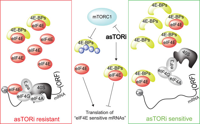 Overexpression of eIF4E and variations in 4E-BP levels and phosphorylation are frequently observed in tumors, thereby suggesting that eIF4E/4E-BP stoichiometry may significantly differ among patients, or even within a single tumor [4]. We demonstrated that the eIF4E/4E-BP ratio determines the ability of asTORi to suppress neoplastic growth [5]. Resistance of malignant cells with high eIF4E/4E-BP ratio to asTORi can be explained by their deficiency to inhibit eIF4F complex assembly and translation of “eIF4E-sensitive” mRNAs (Figure 1). We also showed that cancer cells acquire resistance to asTORi by increasing eIF4E availability via downregulation of 4E-BP1 and 2. These data corroborate earlier findings showing that the amplification of the eIF4E gene underlies resistance to the dual PI3K/mTOR inhibitor BEZ235 [6], and that eIF4E translation activity can predict sensitivity to rapalogs [3]. Therefore, eIF4E/4E-BP ratio, rather than individual levels or phosphorylation status of these proteins, is more likely to serve as a prognostic biomarker to select the patients for clinical trials using asTORi and to tailor personalized mTOR targeted therapies.