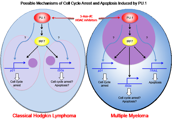 We are now examining the mechanisms for growth arrest and apoptosis induced by PU.1 in classical Hodgkin lymphoma cells and myeloma cell lines. We showed previously that TRAIL is upregulated in myeloma cell lines through direct transactivation by PU.1 and plays a role in apoptosis in those cells [8]. In contrast, TRAIL is initially expressed at high levels in Hodgkin lymphoma and PU.1 does not induce upregulation of TRAIL. In L428 cells, p21 is upregulated by PU.1 induction, and knockdown of p21 rescues growth arrest induced by PU.1, suggesting p21 is involved in PU.1 induced growth arrest. This is also observed with the myeloma cell line, U266. However, p21 is not upregulated following PU.1 induction in another Hodgkin lymphoma cell line, KM-H2, or a myeloma cell line, KMS12PE. Therefore, growth arrest mechanisms do not appear to be the same among all Hodgkin lymphoma and myeloma cell lines. We performed DNA microarray analysis to examine highly upregulated and downregulated genes following PU.1 induction in Hodgkin and myeloma cell lines. Among those genes examined, IRF7, which is important for interferon cascade, is highly upregulated in all four cell lines. Because IRF1 is known to directly transactivate p21, IRF7 may also up-regulate p21. Our data show that many interferon stimulated genes (ISGs) are highly upregulated after PU.1 induction in L428 and U266 cells in parallel with p21 upregulation, but not in KM-H2 and KMS12PE cells, which do not upregulate p21. Therefore, in these cells, other tumor suppressors, including p15, p16, and p73, but not p21 may be transactivated by PU.1. Identifying PU.1 downstream targets that induce growth arrest and apoptosis may serve as a guide to new targeted therapies for Hodgkin lymphoma and multiple myeloma.