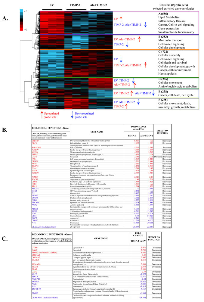 Figure1: TIMP-2 is a transcriptional regulator of human lung cancer A549 cells in vitro. (A) Clustered heat map diagram of microarray data for EV, TIMP-2 and Ala+TIMP-2 overexpressing A549 cells (three replicates). 2480 probe sets determined to significantly change across the three groups with false discovery rate (FDR) <10 are shown in the heat map. The key on the top left assigns heat map colors to the absolute gene expression value on a log2 scale. The most significant Gene Ontology (GO) categories, with the number of probe sets in parentheses, identifying enriched biological processes for each cluster across A549 TIMP-2 and Ala+TIMP-2 cells are shown next to the heat map. Bivariate comparisons of TIMP-2 (B and C) or Ala+TIMP-2 (B) with EV generated lists of functions unique for each comparison. Selected functions (cancer, B and angiogenesis, C) and transcriptional regulators with gene lists and predicted effect on function are shown. The most highly up-regulated (red) and down-regulated (blue) transcripts are presented with at least 1.5-fold change versus EV control.