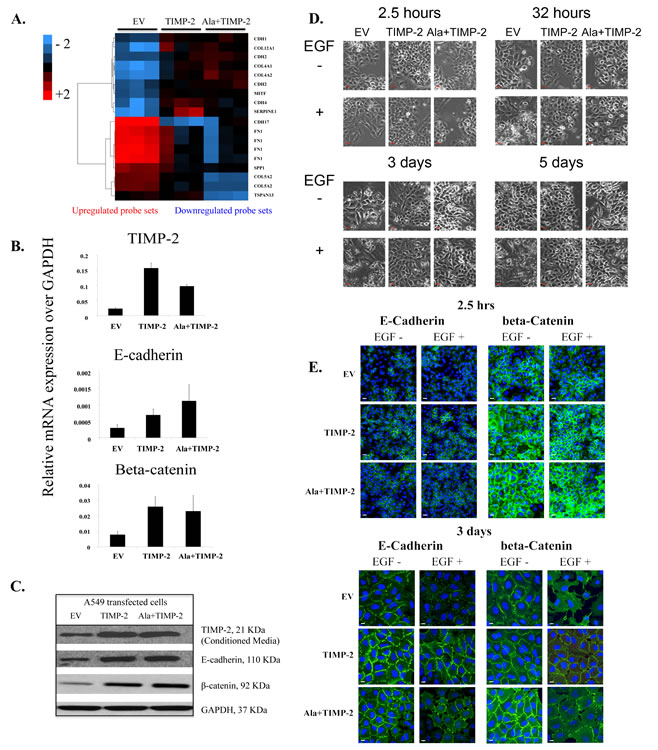Figure2: TIMP-2 overexpression upregulates E-cadherin and beta-catenin complex. (A) A cDNA microarray analysis heat map showing differentially expressed genes related to EMT in A549 EV, TIMP-2 and Ala+TIMP-2 in vitro (FDR <5). The key on the top left assigns heat map colors to the absolute gene expression value on a log2 scale. (B) Real time quantitative RT-PCR and (C) Western blot were performed in A549 cells on selected genes and proteins. (D) Time course experiment showing morphological changes in A549 transfected cells untreated or treated with EGF for 2.5 hrs, 32 hrs, 3 days and 5 days (scale bars: 50 µm) and (E) immunofluorescence staining of E-cadherin and beta-catenin 2.5hrs and 3 days post EGF treatment.