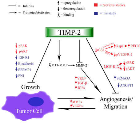 Figure 4: Schematic summary of TIMP-2 anti-tumoral and anti-angiogenic functions. TIMP-2 is primarily understood to both inhibit and activate (via MMP-14/MT1-MMP) MMP-2, which breaks down the ECM, releasing various growth factors (e.g. VEGFs, TGF-β, IGFs) that promote angiogenesis and cell proliferation [1-5]. The process of angiogenesis further induces the up-regulation of MMPs and VEGFs, thus, creating a positive feedback that furthers vascular development and cell growth. Independent of MMP inhibition and activation, TIMP-2 binds to integrin α3β1 receptor, which causes signaling cascades (moderated by SHP-1 and Csk/Src/PAX/Rap1, respectively) that lead to the hypo-phosphorylation of VEGFR-2 and the up-regulation of the anti-migration factor, RECK [12, 20, 41]. Also, previous studies have shown that TIMP-2 binds to endothelial IGF-R1, which causes a net reduction in the phosphorylation of ERK and AKT, and the subsequent decrease in endothelial growth and angiogenesis [11]. Additional TIMP-2 induced, decreases in angiogenic function include the up-regulation of semaphorin-3A and the down-regulation of angiopoietin-1 (Fig 1C). Furthermore, TIMP-2 is associated with the inhibition of tumor, which has been paired with the observed hypo-phosphorylation of FAK and AKT, proteins that contribute to the proliferation and growth of tumor cells [12, 13]. Additionally, as presented in this study, TIMP-2 induces the up-regulation of E-cadherin, CDH1, which increases cell-cell adhesion, effectively inhibiting tumor cell growth, migration, and epithelial to mesenchymal transition (EMT). Finally, additional signs of TIMP-2 induced inhibition of tumor cell growth are the up-regulation of EFEMP1 and the down-regulation of fibronectin-1 (Fig 1B).
