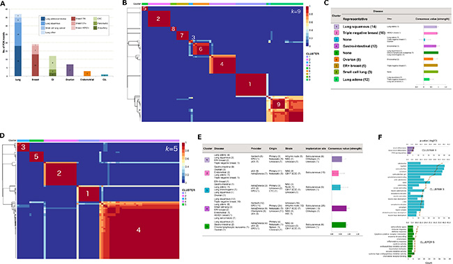 Figure 1: Application of non-negative matrix factorization (NMF) to optimal clustering of human and mouse gene expression. (A) disease representation across the 79 PDX models. (B) consensus matrix at k = 9 for the human transcriptome. (C) contributing cancer types and mean consensus value of each human cluster. “Representative” disease indicates the majority cancer type in the cluster, and numbers of models are given in brackets. Mean consensus value was computed from 200 runs of NMF. (D) consensus matrix at k = 9 for the mouse transcriptome. (E) meta-data breakdown in each mouse cluster and mean consensus value. (F) functional enrichment of the meta-genes driving the mouse clustering. Only clusters with significant functional enrichment (FDR < 0.05) are shown.