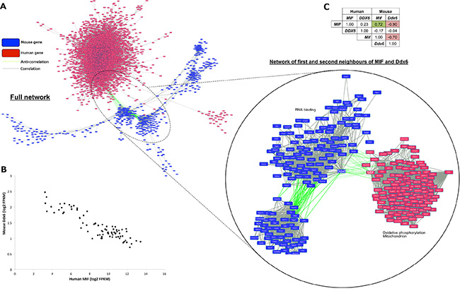 Figure 2: Human MIF and mouse Ddx6 are strongly anti-correlated and are identified as cross-species hubs. (A) Cytoscape [59] rendered human (red boxes) and mouse (blue) gene co-expression network where nodes are genes and edges indicate gene pairs achieving r > 0.85 (grey) or r < −0.85 (green). Magnified view shows sub-network of first and second neighbors of human MIF and mouse Ddx6. (B) scatterplot showing anti-correlation (r = −0.90) between human MIF and mouse Ddx6. (C) r-values between all combinations of human/mouse MIF and DDX6 mRNA expression profiles.