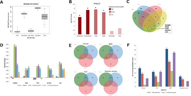 Figure 3: Compartment-specific gene expression markers of BTNBC. (A) comparison of ESTIMATE stromal score between PDX, TCGA, CCLE and clinical stroma samples. (B) fold changes achieved by MMP12 between BTNBC and ER+ luminal-B samples across all platforms (*p < 0.01). (C) derivation of tumor specific BTNBC markers exclusive to cell line and PDX datasets. (D) emergence of tumor specific markers in low stroma TCGA samples (*p < 0.05). (E) overlap of stromal [10], EMT [20], CSC [21] and reactive stroma [22] signatures with BTNBC markers derived from human PDX and TCGA samples. (F) comparison of log10 p-values achieved across sample types by overlap with each of the four signatures (*p < 0.05). CSC: cancer stem cell, EMT: epithelial-mesenchymal transition, MMP12: Matrix Metalloproteinase 12.