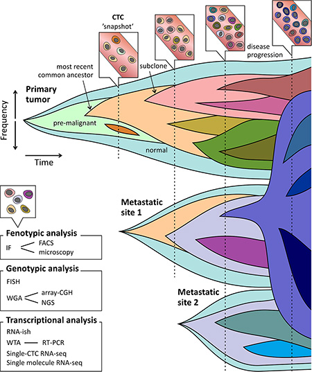 CTCs can be analyzed both as pure cells as well as enriched fractions. Mutation detection of DNA extracted from CTC-enriched samples demonstrated activating mutations in the EGFR, KRAS, and AR genes in patients suffering from lung cancer, colorectal cancer (CRC), and castration-resistant prostate cancer (CRPC) respectively [65, 71, 72]. Additionally, RNA analysis of enriched CTC fractions have been performed using reverse transcription PCR (RT-PCR) amplification of tumor-specific transcripts, such as AR splice variant 7 in CRPC, and translocations like EML4–ALK in lung cancer and TMPRSS2–ERG in prostate cancer [42, 73–75]. However, sequencing of enriched fractions iscomplicated by low levels of tumor-specific templates and contamination by abundant leukocyte-derived sequences, limiting the sensitivity and specificity [76, 77]. Advances in next generation sequencing (NGS) strategies and computational analyses help resolve this challenge. Nevertheless, single CTC sequencing strategies can provide a direct insight into CTC heterogeneity by identifying co-existing mutations within a cell. Heitzer and colleagues, profiled individual CTCs isolated from patients with metastatic CRC, using array-Comparative Genomic Hybridization (CGH) and targeted panel sequencing of 68 genes. Various genomic aberrations in CTCs were found, indicative for their subclonal origin from specific areas of the original tumor [33].