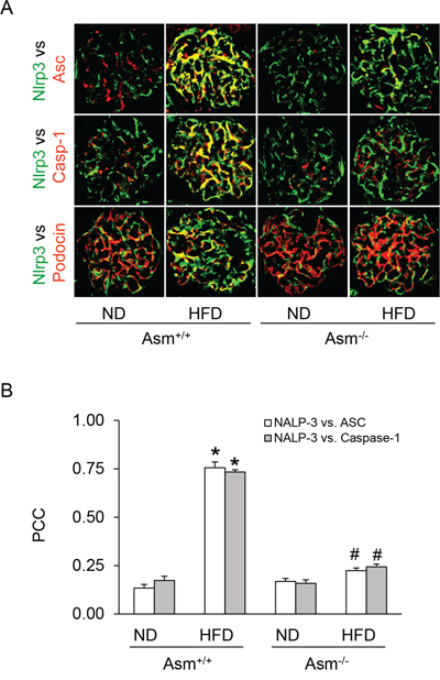 Figure 2: Attenuation of HFD-induced inflammasome formation in glomeruli of Asm+/+ and Asm-/- mice fed a normal diet or high fat diet. A. Colocalization of Nlrp3 (green) with ASC (red), Nlrp3 (green) with caspase-1 (red) and Nlrp3 (green) with podocin (red) in mouse glomeruli. B. Summarized data shows the fold changes of pearson coefficient correlation (PCC) for the colocalization of Nlrp3 (also known as Nalp3) with ASC and Nlrp3 with caspase-1 in glomeruli of Asm+/+ and Asm-/- mice fed with ND or HFD. * Significant difference (P<0.05) compared to the values from control Asm+/+ mice, # Significant difference (P<0.05) compared to the values from Asm+/+ mice receiving the HFD. ND: Normal diet, HFD: High fat diet.