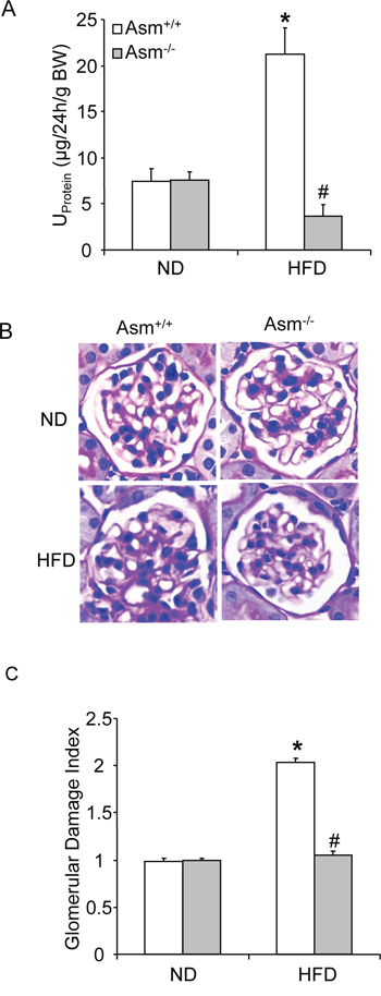 Figure 4: Effects of the normal diet and high fat Diet on glomerular injury in Asm+/+ and Asm-/- mice. Values are arithmetic means ± SEM (n=6 each group) of urinary protein excretion A. in Asm+/+ and Asm-/- mice with or without the HFD. B. Photomicrographs show typical glomerular structure (original magnification, x400) in Asm+/+ and Asm-/- mice fed with or without HFD C. Summarized data of glomerular damage index (GDI) by semi-quantitation of scores in 4 different groups of mice (n=6 each group). For each kidney section, 50 glomeruli were randomly chosen for the calculation of GDI. * Significant difference (P<0.05) compared to the values from Asm+/+ mice on the normal diet, # Significant difference (P<0.05) compared to the values from mice on the HFD.