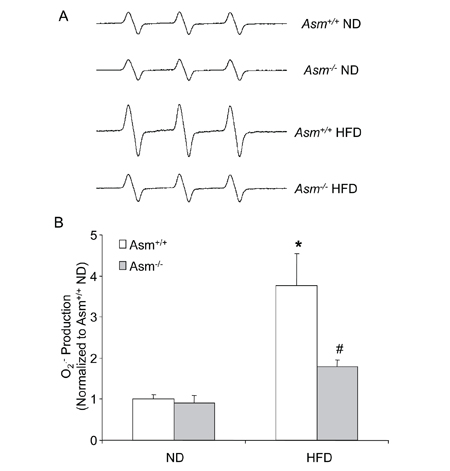 Figure 5: Effects of the normal diet and high fat diet on glomerular O2•− production in Asm+/+ and Asm-/- mice. A. Representative ESR spectra traces for O2 •− production in Asm+/+ and Asm-/-mice. B. Values are arithmetic means ± SEM (n=5 each group) of O2 •− production in Asm+/+ and Asm-/- mice fed with normal diet or high fat diet. * Significant difference (P<0.05) compared to the values from Asm+/+ mice on the normal diet, # Significant difference (P<0.05) compared to the values from mice on the high fat diet. ND: Normal diet, HFD: High fat diet.