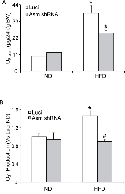 Figure 7: Effects of renal Asm gene silencing on glomerular injury and glomerular O2•− production in C57BL/6J mice with or without the high fat diet. Values are arithmetic means ± SEM (n=5-6 each group) of urinary total protein excretion A. and O2•− production B. in C57BL/6J mice on the normal or HFD with or without Asm shRNA transfection. * Significant difference (P<0.05) compared to the values from control mice on the normal diet, # Significant difference (P<0.05) compared to the values from mice on the high fat diet. Luci: Scrambled shRNA, ND: Normal diet, HFD: High fat diet.