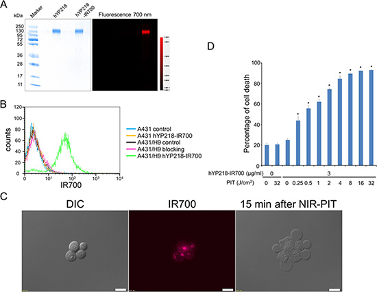 As defined by SDS-PAGE, the band of hYP218-IR700 was almost the same molecular weight as the non-conjugate control, and fluorescence intensity was identical (Figure 1A). After a 6 h incubation with hYP218-IR700, A431/H9 cells showed a high fluorescence signal, which was confirmed with flow cytometry and fluorescence microscopy (Figure 1B and 1C).
