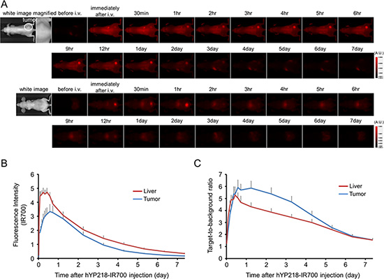 Figure 2: In vivo fluorescence imaging of A431/H9 tumor. (A) In vivo hYP218-IR700 fluorescence real-time imaging of tumor bearing mice (right dorsum). The tumor showed high fluorescence intensity after injection and the intensity gradually decreased over days. Most of the excess agent was excreted into the urine immediately after injection. (B) Quantitative analysis of IR700 intensities in tumor and liver (n = 10). The IR700 fluorescence intensity of tumor and liver shows high intensities within 1 day after APC injection but this decreases gradually over days. (C) Quantitative analysis of TBR in tumors and livers (n = 10). TBR of tumor is high within 1 day after APC injection. However, TBR of liver decreased starting 6 hours after APC injection.