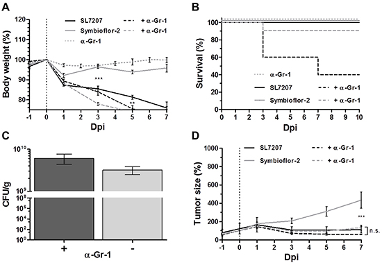 Figure 7: Gr-1 depletion improves tumor therapeutic effects with Symbioflor-2 to the extent of SL7207. RenCa tumor bearing mice received a daily injection of 25 μg anti-Gr-1 mAb (α-Gr-1) i.p. A. Progression in host body weight of Gr-1 depleted mice following infection. B. Mortality rate of Gr-1 depleted mice over the course of infection. C. RenCa tumor colonization 48 hpi with and without depletion of Gr-1 D. RenCa tumor development in Gr-1 depleted mice over the course of infection. N=5-8. Mean ± SEM.