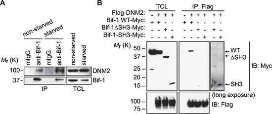 Figure 1: Identification of DNM2 as a Bif-1-interacting protein. (A) HeLa/S cells were incubated in starvation medium (starved) or control complete medium (non-starved) for 2 h and subjected to co-immunoprecipitation using anti-Bif-1 antibodies or control mouse IgG followed by immunoblotting using the indicated antibodies. (B) 293T cells were transiently co-transfected with the indicated plasmids and subjected to co-immunoprecipitation using anti-Flag antibodies followed by immunoblotting using the indicated antibodies.