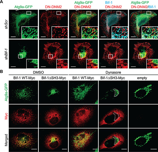 Figure 3: Bif-1 is important for the recruitment of DNM2 to the Atg9-containing membranes. (A) HeLa/Atg9-GFP cells were nucleofected with Myc-DNM2 K44E (DN-DNM2) for 24 h, co-stained for Myc and Bif-1, and analyzed by confocal microscopy. Magnified images are shown as insets. Arrowheads represent DN-DNM2- and Bif-1-positive structures adjacent to the plasma membrane. (B) Bif-1 knockdown HeLa/Atg9-GFP cells were nucleofected with Bif-1 shRNA-resistant Bif-1 WT-Myc, Bif-1 Bif-1ΔSH3-Myc or control empty vector for 24 h, starved in the presence or absence of 80 μM Dynasore for 1.5 h, stained for Myc and analyzed by confocal microscopy. Dashed outline represents GFP-positive but Myc-negative region. Scale bars represent 10 μm.