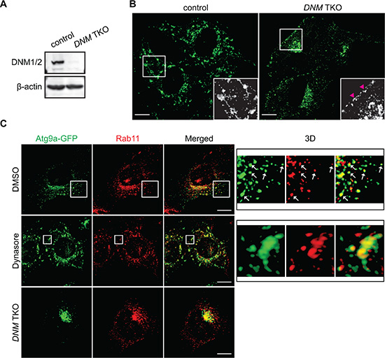 To further validate the importance of the DNM-mediated fission machinery in the regulation of Atg9 vesicles at the Rab11-positive compartments, we next employed an inducible DNM knockout system [22]. We first transduced tamoxifen-inducible DNM triple KO (TKO) mouse fibroblasts with lentiviruses encoding Atg9a-EGFP. The resultant cells were treated with or without tamoxifen to obtain TKO/Atg9-GFP and control/Atg9-GFP cells. Depletion of DNMs was determined by immunoblotting (Figure 6A). Consistent with the results obtained using HeLa/S cells, while nutrient starvation resulted in the translocation of Atg9 vesicles to the peripheral cytoplasmic region, the addition of Dynasore to nutrient-deprived control cells induced Atg9 tubule formation (Figure 6B) although the tubules appeared to be much shorter than those in HeLa/S cells (Figure 4A). Similar to that in HeLa/S cells, many of the cytoplasmic Atg9 vesicles as well as the Dynasore-induced Atg9 tubules in starved control cells were positive for Rab11 (Figure 6C). Most importantly, depletion of DNMs resulted in the accumulation of Atg9 signals at the juxtanuclear Rab11-positive compartments to indicate the importance of DNM for Atg9 membrane tubulation and vesicle formation during starvation. Collectively, these results demonstrate that the generation of Atg9 vesicles during autophagy occurs from Rab11-positive compartments in a DNM-dependent manner.
