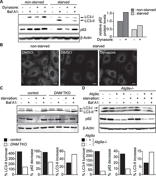 Loss of DNMs or Atg9a accumulates LC3-II and suppresses p62 degradation upon starvation