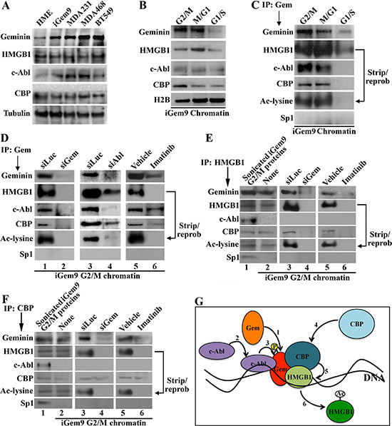 Figure 1: Geminin promotes acetylation of chromatin-bound HMGB1. (A) The levels of indicated proteins in naïve HME, iGem9 cells (defined as Dox-induced for 72 h) and the TNBC cell lines MDA-MB-231, MDA-MB-468 and BT549 sonicated extracts. (B) The levels of indicated proteins on the chromatin of iGem9 cells synchronized in G2/M, M/G1 and G1/S phases. (C) IP experiments using geminin specific antibody on chromatin isolated from G2/M, M/G1 and G1/S phase iGem9 cells and blotted for the indicated proteins. (D) IP experiments using geminin specific antibody on G2/M phase iGem9 chromatin extracts of cells transfected with siLuc, siGem or siAbl for 72 h or treated with vehicle or 10 μM imatinib for 24 h. IP experiments using HMGB1 specific antibody (E) or CBP specific antibody (F) on iGem9 cells synchronized in G2/M-phase sonicated extracts (first lanes), or chromatin extracts following 72 h of transfection with siLuc or siGem or 24 h treatment with vehicle or 10 μM imatinib. (G) Schematic representation of the data presented through out this figure. In all parts of the figure experiments were done between 2–3 separate times.