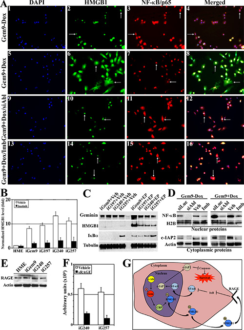 Figure 2: Geminin overexpression enhances HMGB1 acetylation, release from chromatin, cytoplasmic translocation and secretion. (A) Immunofluorescence analysis of HMGB1 and NF-κB/p65 in uninduced Gem9 (1–4) or iGem9 cells before (5–8) or after c-Abl silencing for 72 h (9–12) or inactivation using 10 μM imatinib for 24 h (13–16). (B) The levels of HMGB1 in CM of naïve HME, iGem9, iG197, iG240 and iG257 cells in the presence of vehicle (white bars) or 10 μM imatinib (black bars) for 24 h detected using specific HMGB1 ELISA assay. Experiments were done in triplicates 3 different times, **represents p < 0.001. (C) The levels of HMGB1 and the endogenous inhibitor of NF-κB; IκBα in the cytoplasm of iGem9, iG197, iG240 and iG257 cells in the absence (Veh, left) or the presence (200 μM EP, right) of the inhibitor of HMGB1 release; ethyl pyruvate. (D) The levels of active NF-κB/p65 and the survival factor c-IAP2 in the cytoplasmic or chromatin fraction of uninduced Gem9 cells or iGem9 cells transfected with siLuc or siAbl for 72 h or treated with vehicle or 10 μM imatinib for 24 h. (E) RAGE levels in naïve HME, iGem9, iG240 or iG257 cells. (F) Activation of NF-κB response element in iG240 or iG257 cells following vehicle or 10 μg/ml sRAGE for 24 h. Experiments were done in triplicates 3 different times, **represents p < 0.001. (G) Schematic representation of the data presented throughout this figure. In all parts of the figure experiments were done between 2–3 separate times.