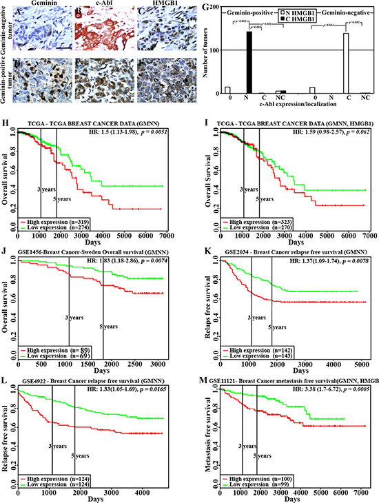 Figure 3: HMGB1 localization and effect on clinical outcome in GemOE tumors. The expression of geminin (A and D), c-Abl (B and E) and HMGB1 (C and F) in geminin-negative (A–C) or geminin-positive (D–F) breast cancer TMAs. (G) Number of tumors with nuclear (white bars) or cytoplasmic (black bars) HMGB1 expression in geminin-positive (left) or geminin-negative (right) tumors subdivided according to c-Abl expression as un (0)-, nuclear (N)-, cytoplasmic (C)- or nucleo-cytoplasmic (NC)- expressing tumors. (H) The rate of overall survival in 593 patients from the TCGA dataset with breast tumors expressing high (red line, n = 319) vs. low (green line, n = 274) geminin with hazard ratio of 1.5 (1.13–1.98) and p = 0.0051. (I) The rate of overall survival in 593 patients from the TCGA dataset with breast tumors expressing high (red line, n = 323) vs. low (green line, n = 270) geminin + HMGB1 with hazard ratio of 1.59 (0.98–2.57) and p = 0.062. (J) The rate of overall survival in 158 patients from the GSE1456 dataset with breast tumors expressing high (red line, n = 89) vs. low (green line, n = 69) geminin with hazard ratio of 1.83 (1.18–2.86) and p = 0.0074. (K) The rate of relapse-free survival in 285 patients from the GSE2034 dataset with breast tumors expressing high (red line, n = 142) vs. low (green line, n = 143) geminin with hazard ratio of 1.37 (1.09–1.74) and p = 0.0078. (L) The rate of relapse-free survival in 248 patients from the GSE4922 dataset with breast tumors expressing high (red line, n = 124) vs. low (green line, n = 124) geminin with hazard ratio of 1.33 (1.05–1.69) and p = 0.0165. (M) The rate of metastatic-free survival in 199 patients from the GSE11121 dataset with breast tumors expressing high (red line, n = 100) vs. low (green line, n = 99) geminin with hazard ratio of 3.38 (1.7–6.72) and p = 0.0005.