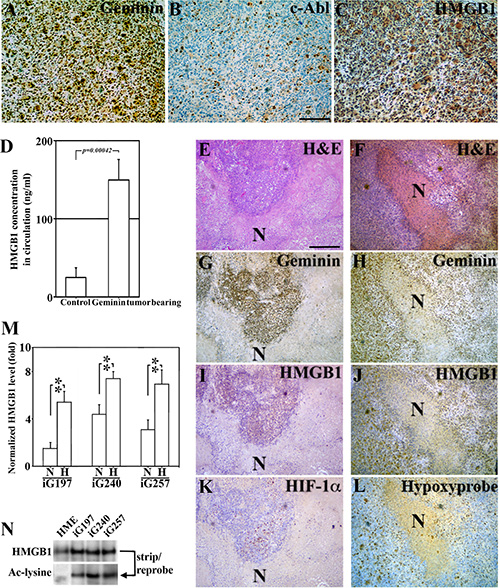Figure 4: Hypoxic/necrotic core in GemOE tumors enhances Ac-HMGB1 secretion. (A–C) Adjacent sections from a GemOE tumor IHC stained for geminin (A), c-Abl (B) and HMGB1 (C). (D) The level of circulating HMGB1 measured using specific ELISA assay performed on serum isolated from samples collected 7 weeks after mice were injected in mammary fat pads with naïve HME cells (n = 10, no tumors developed) or GemOE cells (n = 30, tumor-bearing, p = 0.00042). Two different sets (E, G, I and K) and (F, H, J and L) of adjacent sections from GemOE orthotopic mammary tumors stained with H & E (E and F), or IHC stained for geminin (G and H), HMGB1 (I and J) as well as HIF-1α (K) or hypoxyprobe (L). N denotes necrosis within these tumors that are shown adjacent to the hypoxic cells as indicated by high HIF-1α or hypoxyprobe staining. These cells are also expressing cytoplasmic HMGB1. (M) The levels of HMGB1 detected using specific ELISA assay released from iGem9, iG197, iG240 or iG257 cells grown under normoxic (N) or hypoxic (H) conditions. Experiments were done in triplicates 3 different times, **represents p < 0.001. (N) The level of acetylated HMGB1 passively diffused from naïve HME, iG197, iG240 or iG257 cells after repeated freeze and thaw cycles.