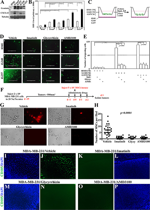 Figure 6: Novel signaling circuit involved in recruitment of MSCs to the vicinity of GemOE tumors, in vitro and in vivo. (A) The levels of geminin and SDF1/CXCL12 expressed in naïve HME, iGem9, iG197, iG240 or iG257 cells. (B) The levels of SDF1/CXCL12 secreted from naïve HME, iGem9, iG197, iG240 or iG257 cells grown under normoxic (N) or hypoxic (H) conditions as detected using specific ELISA assay. Experiments were done in triplicates 3 different times, ***represents p < 0.0001. (C) Schematic representation showing the experimental strategy used in (D and E). (D) Representative images showing the recruitment of GFP-MSC to the lower side of Boyden chambers inserts when naïve HME, iG240 or iG257 cells were layered on the lower wells and cells were grown in the presence of vehicle (1, 5 and 9, respectively), 10 μM imatinib (2, 6 and 10, respectively), 200 μM Glycyrrhizin (3, 7 and 11, respectively) or 10 μM AMD3100 (4, 8 and 12, respectively). (E) Quantitative analysis of the data represented in (D). Experiments were done in triplicates 3 different times, **represents p < 0.001 and ***represents p < 0.0001. (F) Schematic representation of the in vivo strategy used in the experiments used in G-P. (G) Representative images of cell lines generated from subcutaneously generated MDA-MB-231 tumors in Nu/Nu mice that were intracardiac injected with red-labeled MSCs and treated with vehicle, imatinib, glycyrrhizin or AMD3100 for 4 days (day −1, 0, 1 and 2 with regards to MSCs injection) collected 24 h after the last drugs administration (i.e. day 3 after MSCs injection). (H) Quantitative analysis of the data represented in (F). (I–P) Fluorescence immunohistochemical staining using anti-human CD105 (human MSC marker, green) and counterstained with DAPI (blue) of sections from the MDA-MB-231 tumors described in F. Except the in vivo part, all parts are of experiments that were done 2–3 separate times.