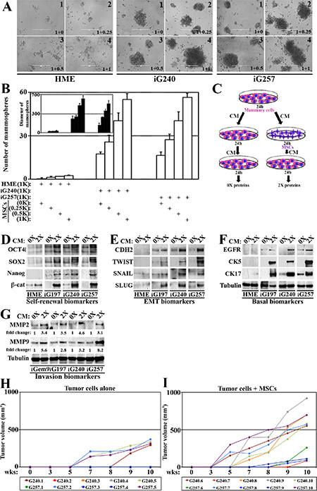 Figure 7: MSCs enhance GemOE aggressiveness, in vitro and in vivo. (A) Mammosphere formed when 1000 naïve HME, iG240 or iG257 cells were plated alone or mixed with 250, 500 or 1000 MSCs. (B) Quantitative analysis of the data represented in (A). Experiments were done in triplicates 3 different times with p values between 0.0010–0001. Inset shows diameter of mammosphere developed in (A). Experiments were done in triplicates 3 different times with p values between 0.0010–0001. (C) Schematic representation of the experiments described in (D–F). The levels of indicated self-renewal biomarkers (D), EMT biomarkers (E) or basal biomarkers (F) in proteins extracted from naïve HME, iG197, iG240 or iG257 cells following the 0× or 2× treatment. (G) Similar experiments showing the levels of the invasion proteins MMP2 and MMP9 in proteins extracted from iGem9, iG197, iG240 or iG257 cells following the 0× or 2× treatment. (H) The size of orthotopic tumors developed in Nu/Nu mice injected with 2 × 106 iG240 (T1-T5) or 2 × 106 iG257 (T6-T10) cells within 10 weeks set limit for the experiment. (I) The size of orthotopic tumors developed in Nu/Nu mice injected with 2 × 106 iG240 + 3 × 105 MSCs (T11–T15) or 2 × 106 iG257 + 3 × 105 MSCs (T16–T20) cells within 10 weeks set limit for the experiment. In all parts of the figure experiments were done between 2–3 separate times.