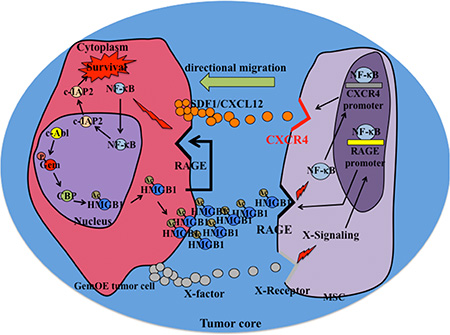 Within this core, dying/necrotic or surviving/hypoxic GemOE tumor cells release Ac-HMGB1. RAGE and not TLR4 is constitutively expressed by all GemOE tumor cells. This suggests that through autocrine/paracrine binding to these RAGE receptors, Ac-HMGB1 activates NF-κB signaling and promotes survival of these hypoxic GemOE tumor cells within tumor cores. In contrast, only after exposure to GemOE tumor cells CM, RAGE expression was initiated on the surface of MSCs. Activation of RAGE expression and activation was also directly correlated with CXCR4 induction and activation on the surface of MSCs also through activating NF-κB signaling [4, 5]. These CXCR4 expressing MSCs later migrate towards SDF1 secreting GemOE cells in the cores. This suggests that within the cores RAGE plays different functions. We also showed that HMGB1 passively diffused out of dying necrotic cells in the cores is also acetylated and thus could also be involved in the directed migration of MSCs towards SDF1 secreting GemOE tumor cells within the cores. Schematic representation of the conclusions from our studies is shown in Figure 8.