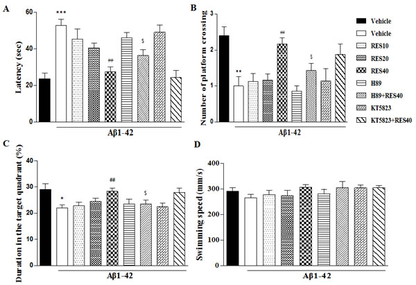 To examine the effect of resveratrol on Aβ42-induced memory deficits, 10 mice each group were tested for memory using Morris water maze and passive avoidance tasks: (a) saline+vehicle; (b) Aβ42+vehicle; (c) Aβ42+resveratrol (10, 20, 40 mg/kg); (d) Aβ42+H89; (e) Aβ42+H89+resveratrol (40 mg/kg); (f) Aβ42+KT5823; (g) Aβ42+KT5823+resveratrol (40 mg/kg). Fourteen days after microinfusion of Aβ42, mice were treated with different doses of resveratrol or vehicle, once per day for 3 weeks before Morris water maze and passive avoidance tests were performed. The behavioral tests were subjected 30 min after the last drug treatment.