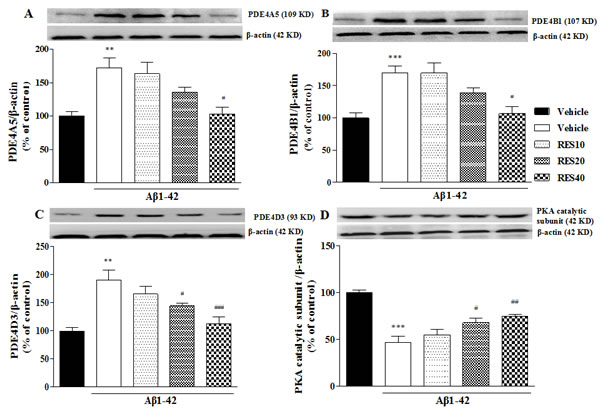Figure 6: Effects of resveratrol on PDE4A, PDE4B, PDE4D variants and PKA catalytic subunit D. expression in the hippocampus of Aβ 42-treated mice (mean±SEM, n = 10). **p < 0.01 and ***p < 0.001 vs. vehicle-treated sham group. #p < 0.05, ##p < 0.01 and ###p < 0.001 vs. vehicle-treated Aβ group.