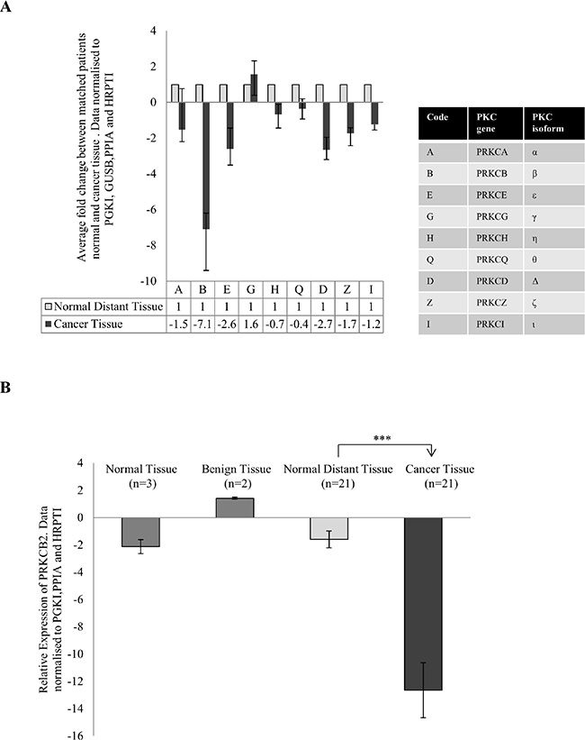 Figure 1: Gene expression of PKC genes in colon cancer. Tissue samples measuring approximately 0.5 cm in diameter were collected from 21 patients undergoing surgery in University Hospital Limerick. Normal tissue from the 21 patients was also collected approximately 10 cm away from the cancer tissue. RNA was extracted from the tissue, cDNA was synthesised and real time PCR was carried out. All data was normalized using the housekeeping genes PRGK1, GUSB, PPIA and HRPT1. (A) Average fold change of the 9 PKC coding genes in cancer tissue of patients compared to each patients normal tissue (n = 21). Each individual patients fold change was analysed using the REST© software. The table explains the corresponding PKC coding gene and PKC isoform. (B) Gene expression of PRKCB in normal tissue (n = 3), benign tissue (n = 2) and cancer tissue (n = 21) relative to normal distant tissue (n = 21). Data was analysed using the delta delta ct method (Statistical significance based on the Welch test and Bonferroni test ***p < 0.01).